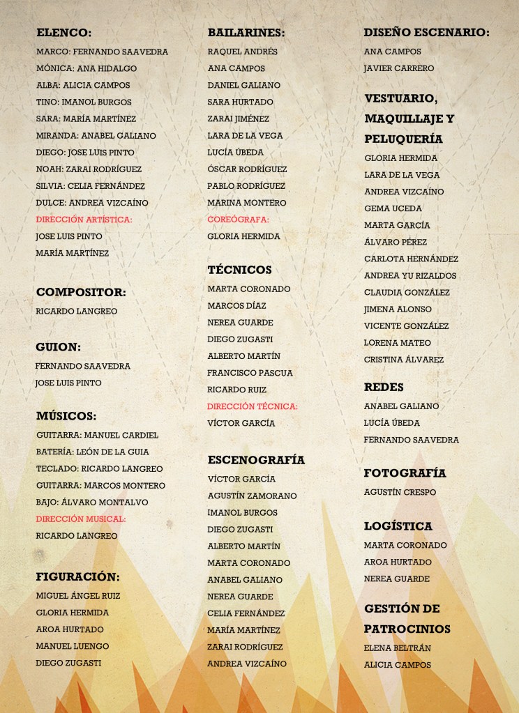 Los invisibles fueron muchos. No lo verás en las fotos de esta web, pues son invisibles, incluso son los que están haciendo esas fotos que tú ves. Ni los viste encima del escenario. Son los/las técnicos de sonido y los técnicos de luces que asisten a cada ensayo para diseñar todo lo necesario. Los chicos y chicas de atrezzo, de vestuario, de peluquería y maquillaje, los que nos llevan la merienda… y nuestros directores.